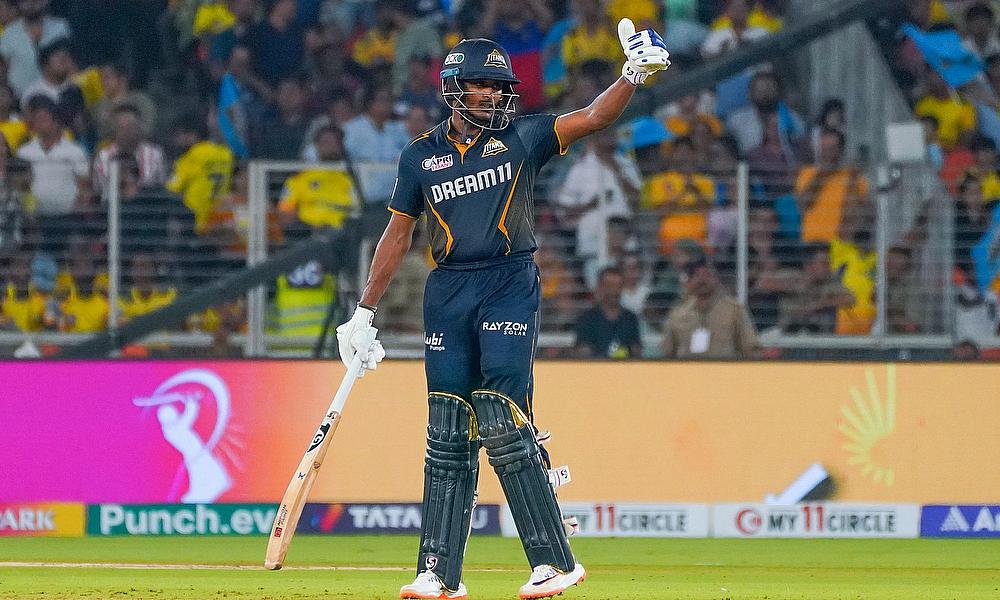 Gujarat Titans' Sai Sudharsan celebrates his century during the IPL