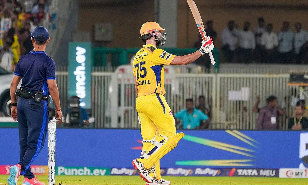 Chennai Super Kings' Daryl Mitchell celebrates his half-century