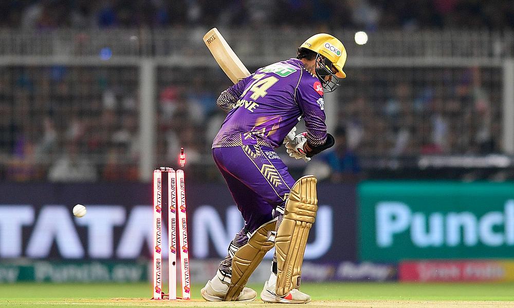 Kolkata Knight Riders' Sunil Narine is bowled out by Mumbai Indians' Jasprit Bumrah