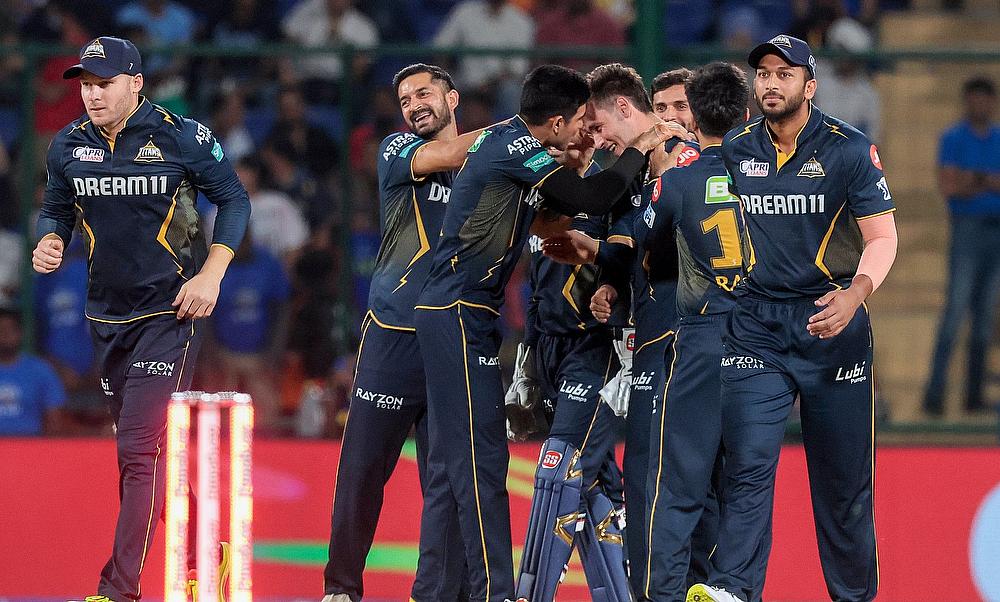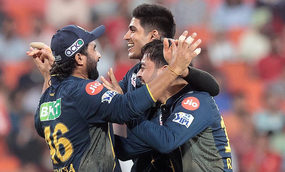 Gujarat Titans players celebrate the dismissal of Delhi Capitals' Prithvi Shaw