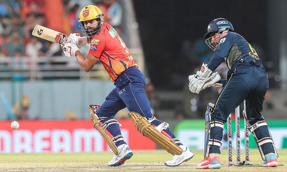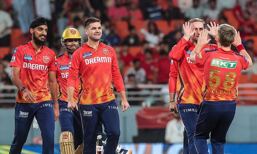 Punjab Kings' Liam Livingstone celebrates the dismissal of Gujarat Titans' captain Shubman Gill