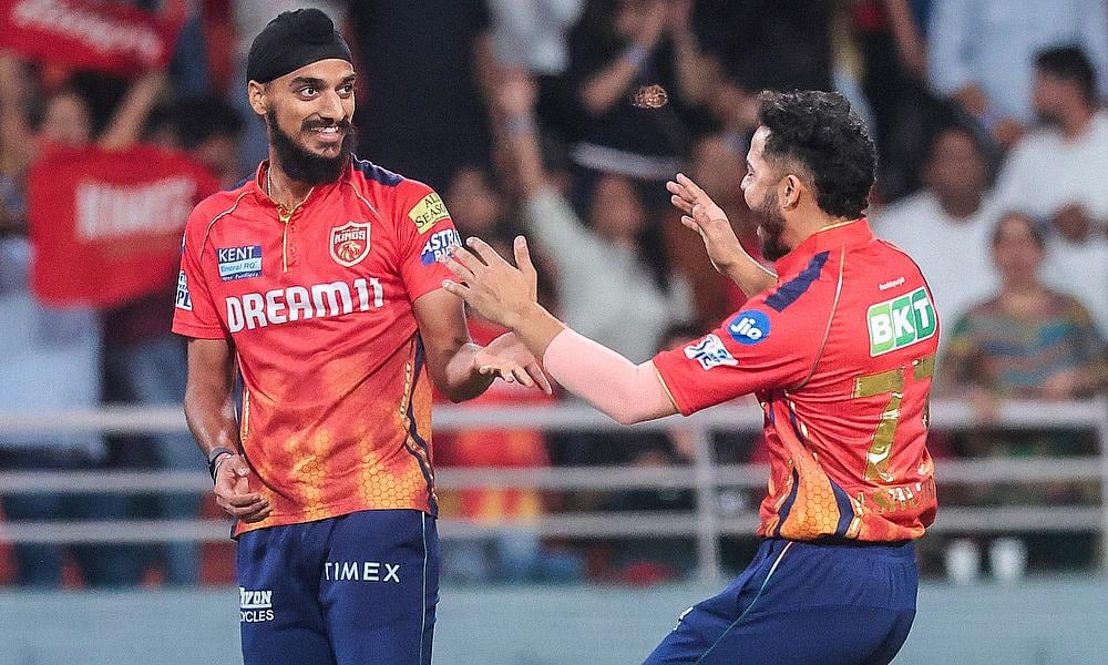 Punjab Kings' Arshdeep Singh celebrates the dismissal of Gujarat Titans' Wriddhiman Saha