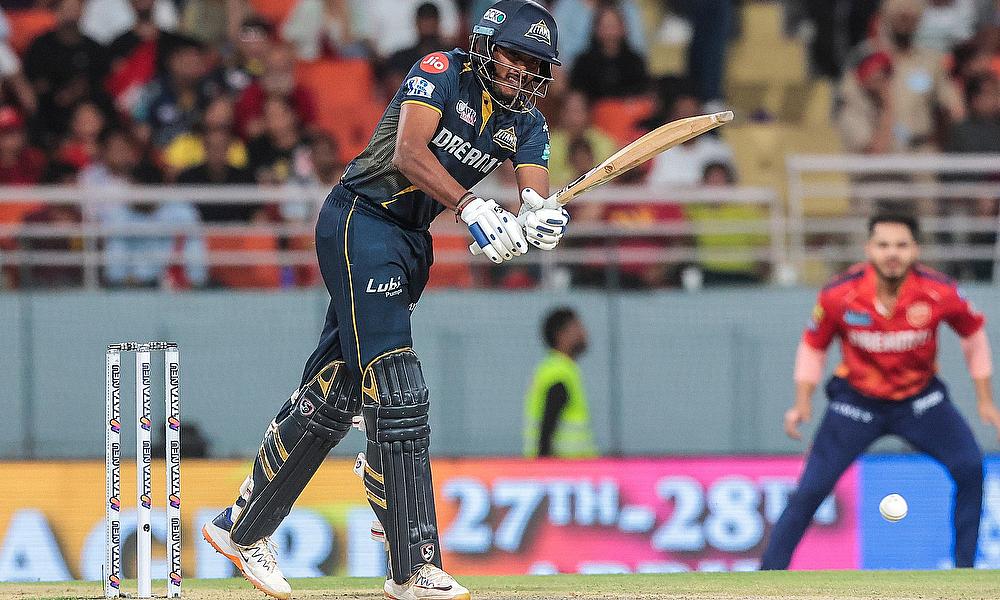 Gujarat Titans' Sai Sudharsan plays a shot during the IPL