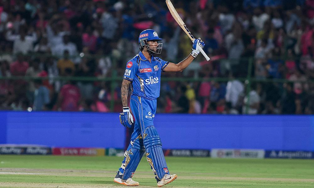 Mumbai Indians' Tilak Varma celebrates his half-century during the IPL