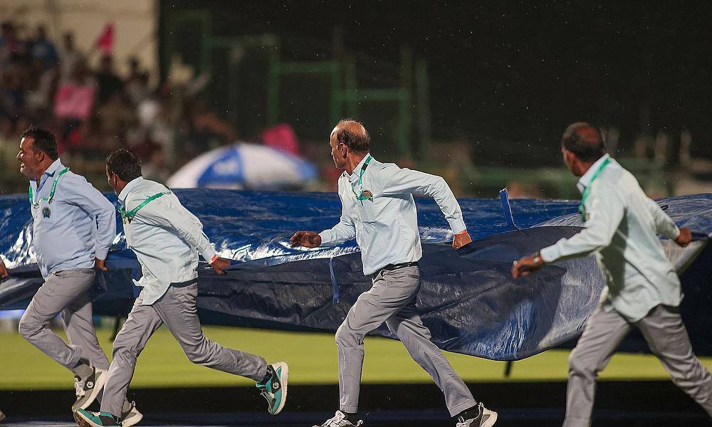 Grounds men bring covers as rain disrupts the IPL