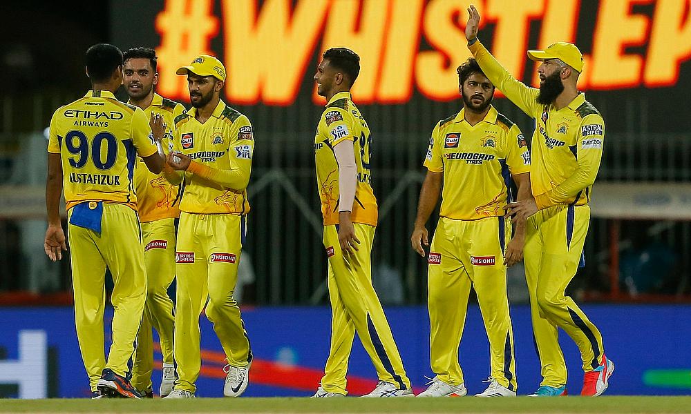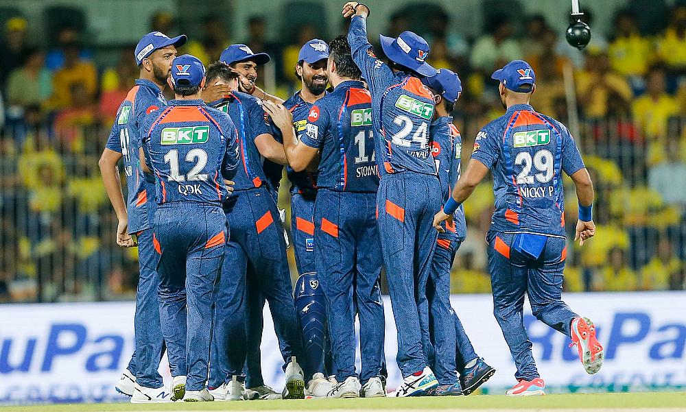 Chennai Super Kings players celebrate the dismissal of Lucknow Super Giants captain KL Rahul