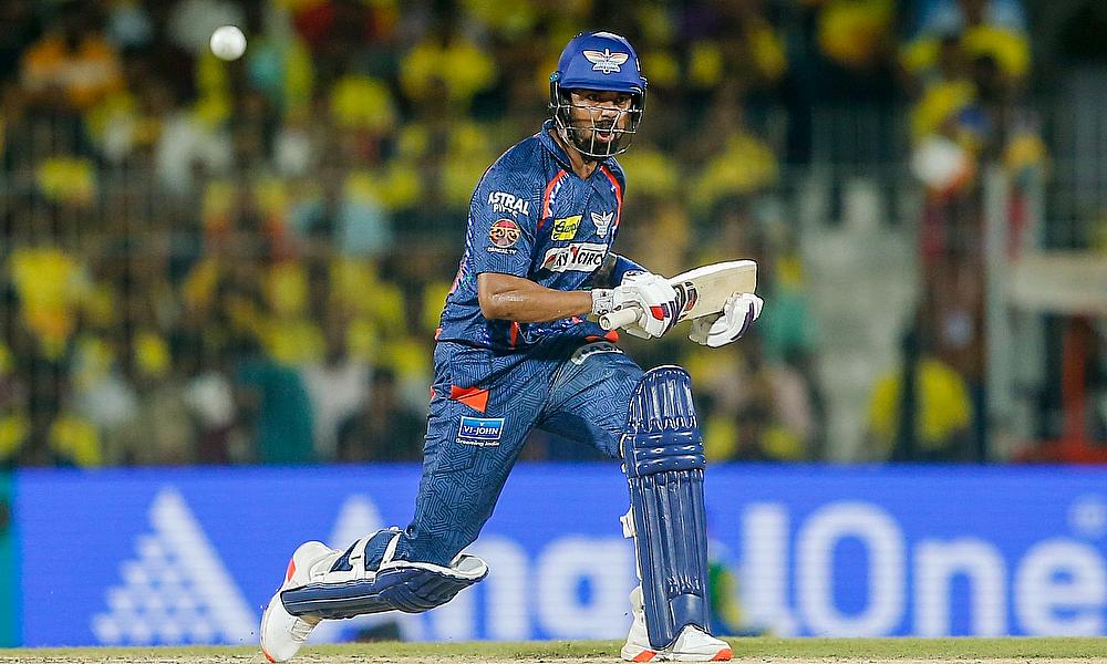 Lucknow Super Giants captain KL Rahul plays a shot during the IPL