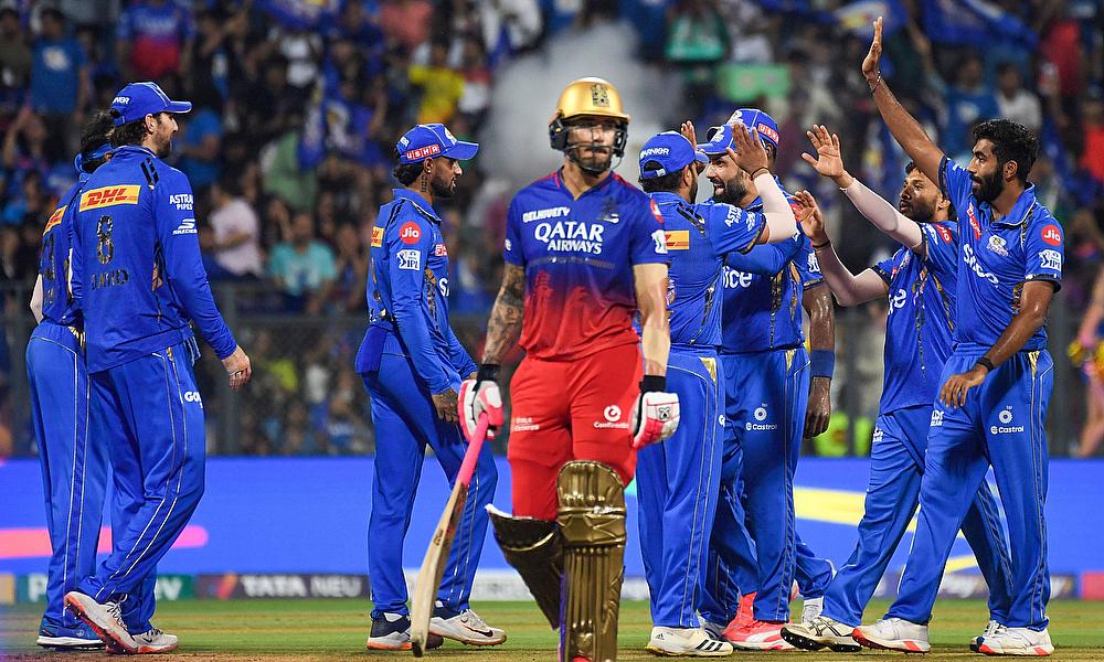 Mumbai Indians' Akash Madhwal celebrates the wicket of Royal Challengers Bangaluru's Will Jack with teammates