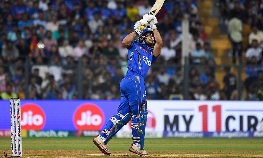 Mumbai Indians' Ishan Kishan hits a six during the IPL