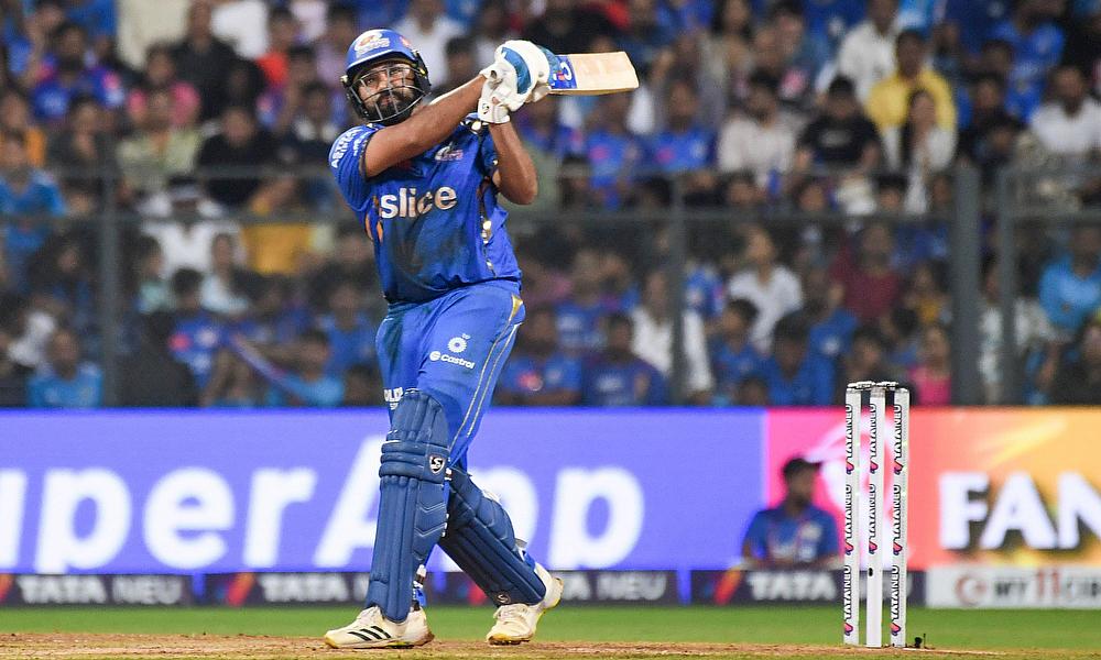 Mumbai Indians' Rohit Sharma hits a six during the IPL