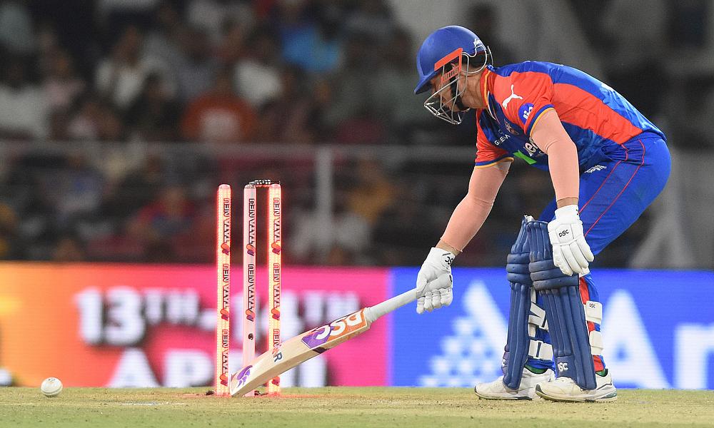 Delhi Capitals' David Warner reacts after he is bowled